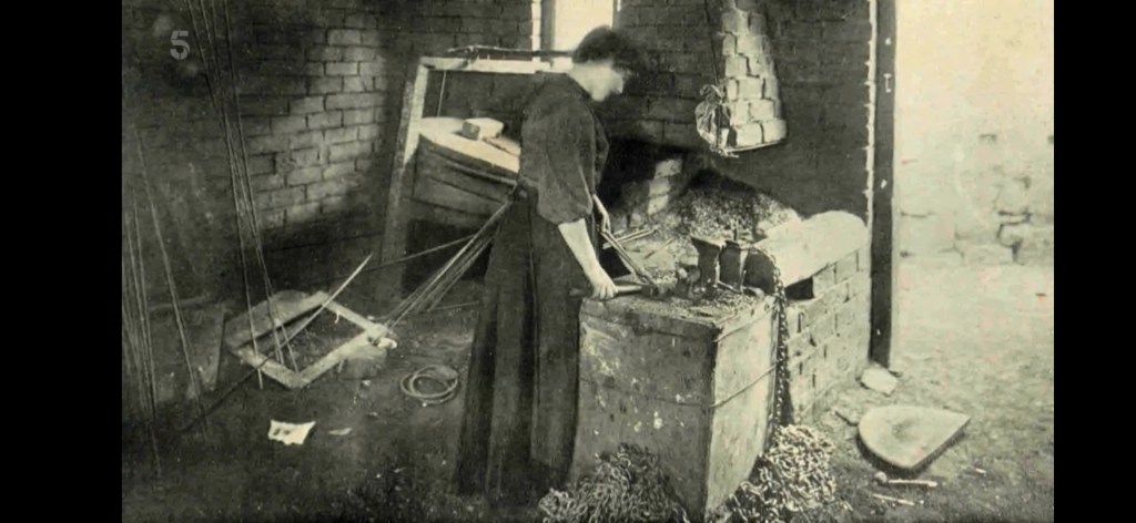 The women worked from “home”. Making small chaines. Their little houses were also their work shops. Hot and smokey. From dawn till night. Got paid ½ the men’s wages. 5 shillings a week, 20£ today.