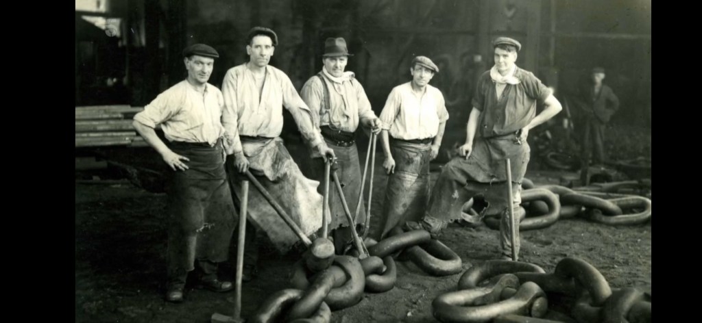 In Little Wenlock, not far from Birminghan, were the mines and steel production. The heavy work was done by both miners and steelworkers. The main products were Chaines. The big heavy ones were made by the men. 9 hrs p day, 6 days a week. For 10 shilling.