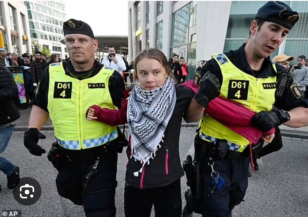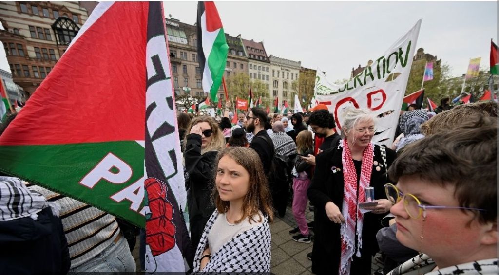 European “protestors” are mixing a peaceful Palestian flag with El Fatah shawls to cover their face. The already politicalized Eurovision Songfestival was abused with pro-Palestinion statements. Climate Greta Thunberg was arrested outside the festival hall.